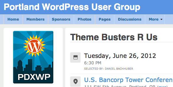 This coming Tuesday (June 26, 2012 at 6:30 PM) I’m giving a talk on WordPress themes, as part of this month’s Portland WP User Group.